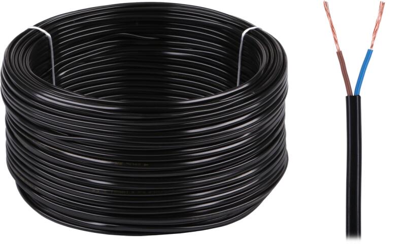 Kábel neve: PVC szigeteléssel és köpennyel A vezetékek száma: 2 Vezetők keresztmetszete: 0,5 mm Névleges feszültség: 300/300 V Megengedett üzemi hőmérséklet: 70 °C Szabvány: PN-91/E-90103 Felhasználás: Száraz helyiségekben kis hordozható vevőkészülékekhez és irodai gépekhez Tekercs: 100 m Szín: Fekete