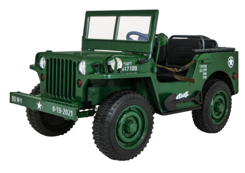 Retro Erős katonai autó változtatható hajtással A változtatható 4x4 vagy 2x2 hajtású terepjáró a jármű teljes teljesítményét használja fel, amely minden körülmények között hatékony működéséhez szükséges. A gyermek biztonságosan mozoghat változatos terepen , és amikor sík terepen utazik, átvált az üzemanyag-takarékos 2x2 üzemmódra . Akár 4 hatékony, egyenké