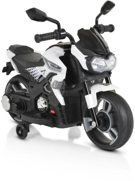 Vigyázz, kész, rajt! Ezzel a vagány elektromos motorral minden gyermeki álom valóra válhat. A lábpedál és a picike pótkerék még nagyobb biztonságot biztosít a kis motorosoknak. A motor 7 km/h sebességre képes, amelyet egy be- és kikapcsoló gomb segítségével lehet szabályozni. A motor indításakor a lámpák felkapcsolódnak, és hallható a motor hangja is, amely még való