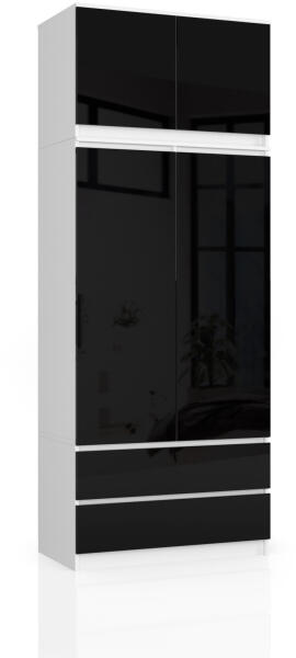 Modern, magasított ruhásszekrény két ajtóval és két fiókkal, amely tökéletes tárolási megoldást kínál. A fehér korpusz és a magasfényű fekete frontok elegáns kontrasztot alkotnak, míg a 234 cm-es magasság maximális tárolókapacitást biztosít. Maximális tárolókapacitás elegáns kivitelbenEz a modern ruhásszekrény tökéletesen ötvözi a funkcionalitást és a stílu