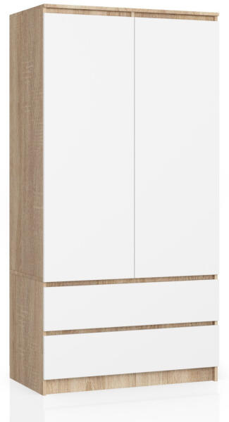 Modern, kompakt ruhásszekrény 2 ajtóval és 2 fiókkal, amely tökéletes tárolási megoldást kínál. A Sonoma tölgy test és fehér frontok elegáns kombinációja minden hálószobába stílusos megjelenést kölcsönöz. Elegáns tárolási megoldás kis terekbeEz a modern ruhásszekrény tökéletes egyensúlyt teremt a funkcionalitás és az esztétika között. A 90 cm széles szekré