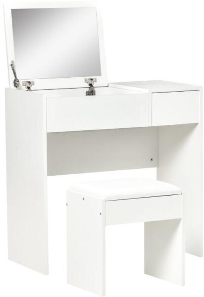 WC/sminkasztal, fehér, összecsukható tükörrel, belső rekesszel, oldalsó fiókkal és zsámollyal, 80x40x79 cm Tulajdonságok: Ideális bútort képvisel nők számára, és nem csak! Ezzel a tükrös öltözőasztallal minden alkalommal gyorsan rendet tehet. Tökéletes sminkeléshez és higiéniai ápoláshoz. Emelje fel a tetejét, és minden smink vagy arc- és arcápoláshoz szükséges