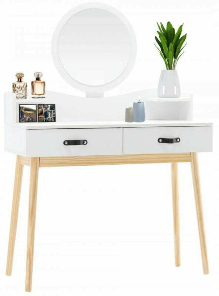 Skandináv stílusú fehér fésülködőasztal, tükörrel, kis székkel 100 X 40 X 139 CMEgy funkcionális, minimalista, skandináv stílusú fésülködőasztal remek kiegészítője lehet egy lányszobának. A fehér fésülködőasztal kerek tükörrel, tágas fiókokkal és kényelmes székkel tökéletes lesz a sminkeléshez, a frizura elkészítéséhez, az öltözékek formázásához és