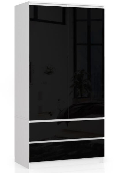 Modern, kétajtós ruhásszekrény 2 fiókkal, amely egyesíti a fehér korpusz eleganciáját a magasfényű fekete frontokkal. Praktikus belső elrendezés 4 polccal és ruhaakasztó rúddal, kiváló minőségű 16 mm-es laminált bútorlapból készült. Elegáns tárolási megoldás modern otthonokbaEz a 90 cm széles ruhásszekrény tökéletes kombinációja a funkcionalitásnak és a moder