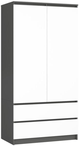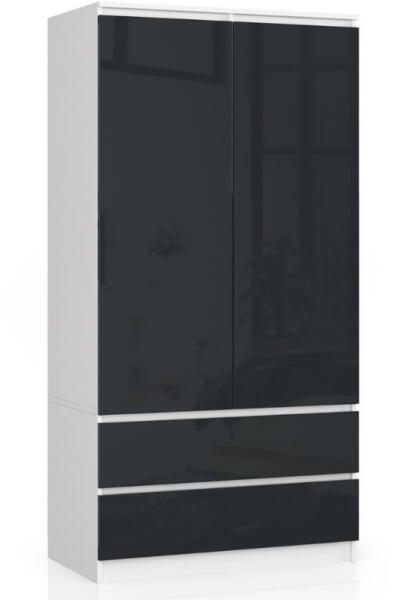 Modern, kétajtós ruhásszekrény két fiókkal, amely tökéletes tárolási megoldást kínál. A fehér korpusz és a magasfényű grafit frontok elegáns kontrasztot alkotnak, míg a praktikus belső elrendezés maximális helykihasználást biztosít. Elegáns tárolás modern kivitelbenEz a 90 cm széles, 180 cm magas ruhásszekrény tökéletes választás a modern otthonokba. A fehér kor