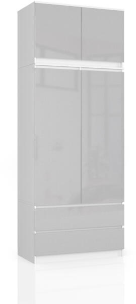 Modern, tágas rátétes szekrény 2 ajtóval és 2 fiókkal, amely ötvözi a fehér korpusz és a magasfényű metál frontok elegáns kontrasztját. Kiváló minőségű 16mm-es laminált lapból készült, ABS élzárással a tartósság érdekében. Elegáns tárolási megoldás modern otthonokbaEz a 234 cm magas rátétes szekrény tökéletes választás azoknak, akik nagy tárolókapacitá
