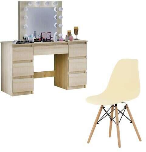 Skandináv stílusú fésülködőasztal + skandináv stílusú szék, Mercaton, Vanessa, tölgyfa, tükörrel és LED-del, 130x43x143 cm Jellemzők: sminkasztal: Rendkívül gondosan elkészített bútordarab, amely tökéletesen illeszkedik hálószobájába. A bútor hagyományosan 16 mm vastag laminált lapból készül, mindkét oldalán nagyon vastag. Az egyediséget a LED izzókkal történ