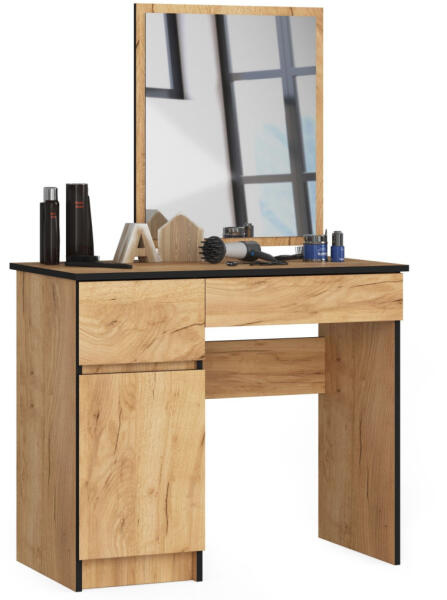 Modern fésülködőasztal tükörrel, tölgy craft kivitelben, két fiókkal és tágas tárolóhellyel. Baloldali kialakítású, kompakt méretű bútor, amely tökéletes választás hálószobákba és szépségszalonokba egyaránt. Stílusos és praktikus fésülködőasztal a mindennapi szépségápoláshozEz a modern vonalvezetésű fésülködőasztal tölgy craft színben ideális válas