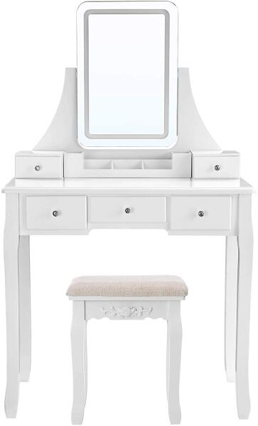 fésülködőasztal LED világítással 3 színben, fésülködő asztal tükörrel és 5 fiókkal, kozmetikai asztal kivehető sminkrendszerezővel, fésülködő asztal párnázott székkel, fehér Készen állsz a nagy megjelenésre? Kapcsold fel a fényt a fésülködőasztal tükrében, miközben tökéletesíted a sminkedet! Az érintőgombbal módosíthatja a LED világítás intenzitását