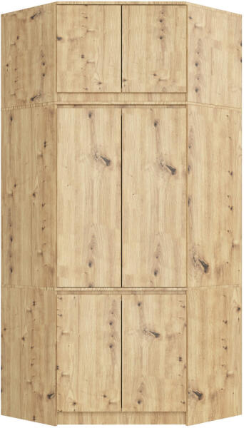 Tágas, 6 ajtós sarok ruhásszekrény felső szekrénnyel, amely tökéletes megoldást nyújt a ruhatár rendszerezett tárolására. Az Artisan tölgy kivitelű, laminált bútorlapból készült szekrény elegáns megjelenést és maximális funkcionalitást biztosít. Maximális tárolókapacitás elegáns kivitelbenEz a 235 cm magas sarok ruhásszekrény tökéletes megoldást kínál a nagy