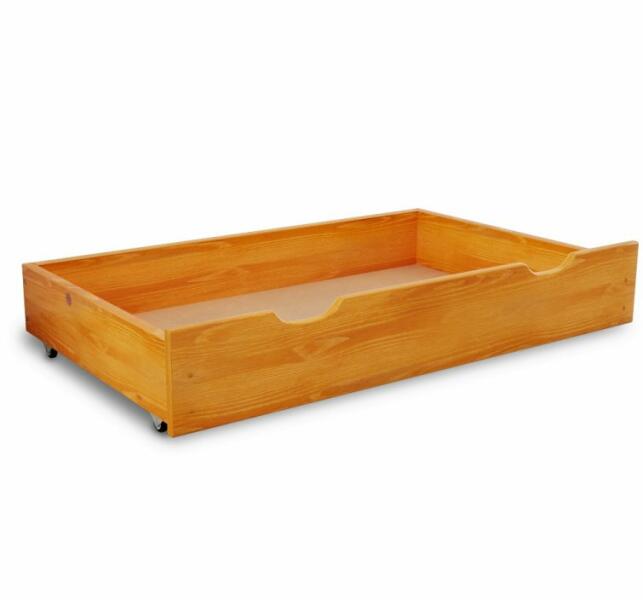 Ágyneműtartó fiók fenyőfából, 150 cm hosszúsággal. A kerekes fiók első osztályú fenyőfából készül, égerfa színben. A 200 cm-es standard ágyak alatt a fiókokból kettő is elfér. A tárolóhely minden kínált ágyhoz megfelelő. A fiókhoz, ágyakhoz éjjeliszekrényeket is kínálunk. Minden fenyőfából készült.