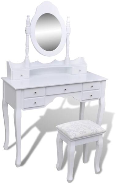 Az időtlen és kifinomult megjelenésű, tükörrel ellátott fésülködőasztal hálószobája berendezésének remek kiegészítője lehet, miközben kozmetikai eszközei mindig kéznél vannak! Tartós anyag: A szerelt fa kivételes minőségű, sima felületű, szilárd, stabil, és ellenáll a nedvességnek. Ez a szerelt fából készült pipereasztal könnyen tisztítható. Bőséges táro