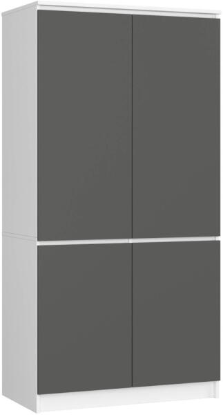 Modern, négyajtós ruhásszekrény kopásálló laminált lapból, fehér és grafitszürke színkombinációban. Praktikus belső elrendezéssel és ruhaakasztó rúddal, tökéletes választás a rendezett tároláshoz. Elegáns tárolási megoldás modern otthonokbaEz a négyajtós szekrény a funkcionalitás és az esztétikum tökéletes ötvözete. A 90 cm széles, 180 cm magas és 51 cm m