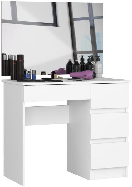 Modern, fehér sminkasztal nagy tükörrel és 4 tágas fiókkal, amely tökéletes választás a mindennapi szépségápolási rutinhoz. A 90 cm széles asztal praktikus tárolási megoldásokat kínál, miközben elegáns megjelenésével bármely hálószoba dísze lehet. Elegáns és praktikus sminkasztal a tökéletes szépségápolási rutinhozEz a modern fehér sminkasztal tökéletes kombi