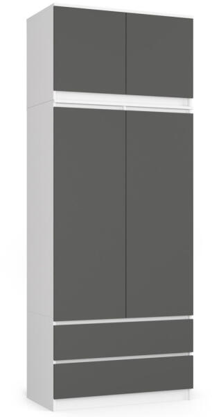 Modern, kétajtós magasított ruhásszekrény beépített felső tárolórésszel és két fiókkal. A fehér korpusz és szürke frontok elegáns kombinációja tökéletes tárolási megoldást nyújt a hálószobába vagy gardróbba. Maximális tárolókapacitás stílusos kivitelbenEz a modern vonalvezetésű magasított ruhásszekrény tökéletes megoldást kínál a ruhatár rendszerezett