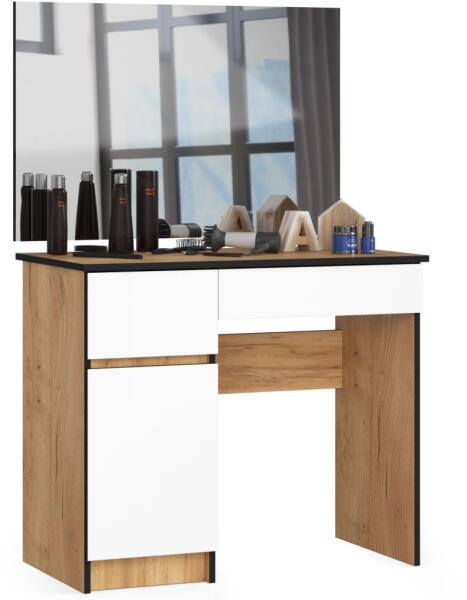 Modern fésülködőasztal nagy tükörrel, tölgy craft és fehér színkombinációban. Két fiókkal és tágas szekrényrésszel rendelkezik, tökéletes választás a mindennapi szépségápolási rutinhoz. Elegáns és praktikus fésülködőasztal a tökéletes szépségápolási rutinhozEz a modern vonalvezetésű fésülködőasztal tökéletesen ötvözi a funkcionalitást és az esztét