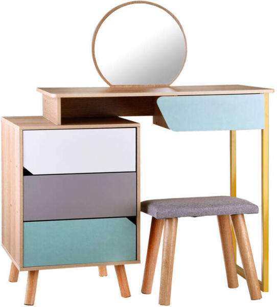 Modern stílusú, világos pasztell színű fésülködőasztal, tükörrel, kis székkel - 40 cm x 80 cm Egy modern, világos színekben pompázó fésülködőasztal nagy tükörrel, fiókokkal és sámlival nagyszerű kiegészítője lehet minden lány szobájának. Egy fésülködőasztal tágas fiókokkal, kerek tükörrel, nagy asztallappal és puha, szürke szövettel kárpitozott kis szék