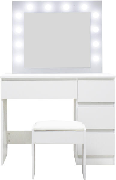 Modern, kompakt asztalka, mely mindennapi társává válik majd. Vele kezdődik a reggel, sminkelje ki magát és irány a nagyvilág. Eredeti mégis praktikus dizájnjába egyszerűen már az első látásra beleszeret. Legnagyobb előnye a hatalmas tükör, melyet 12 LED izzó szegélyez. Fésülkődő asztalka 4 fiókkal és izzósoros tükörrel Ez a fésülködő asztalka nagy tárhelyet biz