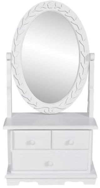 Ez a tetszetős bútordarab antik bájt csempész a fésülködőasztalára. Középen egy stílusos, ovális, dönthető tükör kapott helyet. Az alj két kisebb és egy nagyobb kihúzható fiókból áll, ahol értékeinket tárolhatjuk. A fiókok könnyen kivehetők tisztításkor. Ez a pipereasztal kiváló minőségű MDF-ből készült. A lágy, fehér bevonat és a kifinomult kézművesmun