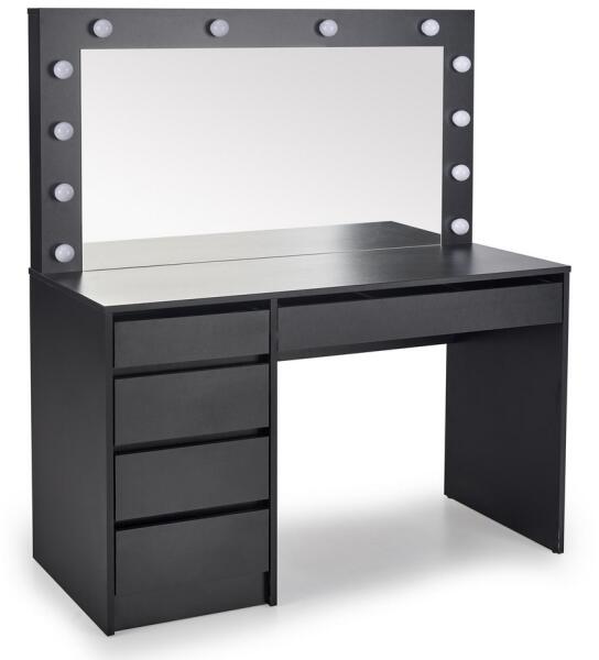Ez a modern és stílusos dizájnú sminkasztal hálószoba berendezése nagyszerű kiegészítője lehet. Az öltözőasztal forgácslemezből PVC sarkokból készült, így stabil és strapabíró. Tágas fiókjának és polcrendszerének köszönhetően elegendő tárolóhely áll rendelkezésre benne az összes szépészeti terméke, illetve minden olyasmi számára, amit elérhető közelség