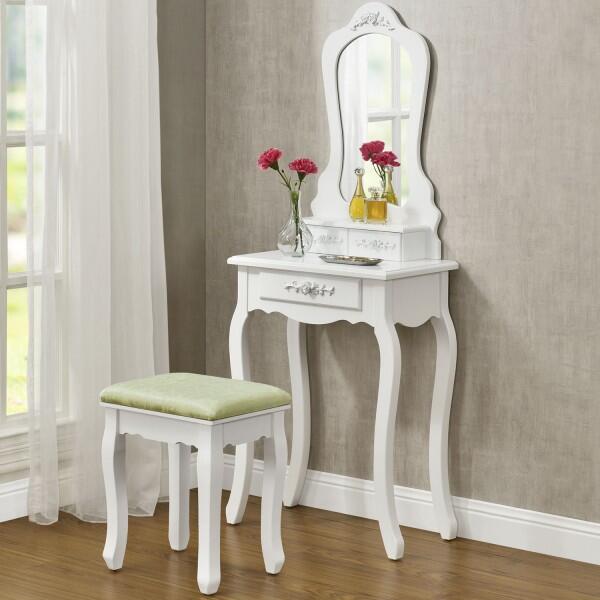 Az időtlen és kifinomult megjelenésű, tükörrel ellátott fésülködőasztal hálószobája berendezésének remek kiegészítője lehet, miközben kozmetikai eszközei mindig kéznél vannak! Tartós anyag: A szerelt fa kivételes minőségű, sima felületű, szilárd, stabil, és ellenáll a nedvességnek. Ez a szerelt fából készült pipereasztal könnyen tisztítható. Bőséges táro