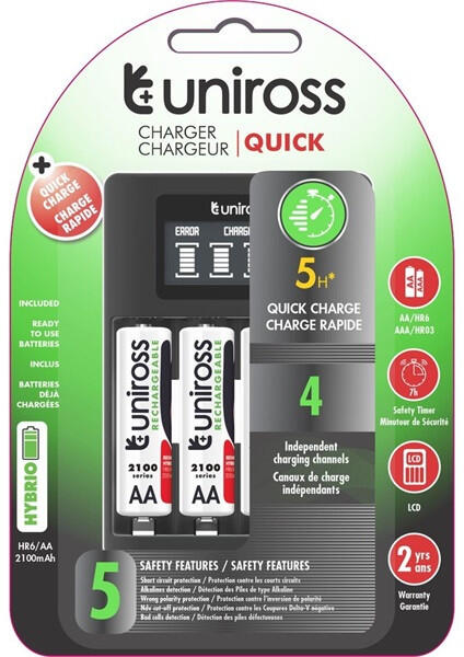 Uniross UCU002A 2100mAh Hybrio Ni-Mh LCD akku gyorstöltő + 4xAA akku 4 töltőfiókos gyorstöltő professzionális felhasználásra, 2 db AA 2100 mAh-s akkumulátorral. Jellemzők: Micro USB bemenet Könnyen leolvasható LCD kijelző Ötszörös védelem: behelyezett elemek, hibás akkumulátorok automatikus felismerése, rövidzárlat és fordított polaritás elleni védelem, túltöltés ell