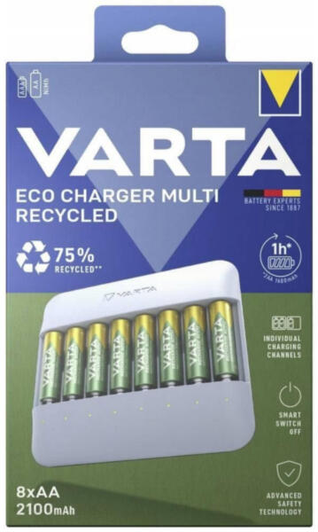 ECO TÖLTŐ A VARTA Eco Chargers Recycled maximális fenntarthatóságot kínál kompromisszumok nélkül! A fejlett biztonsági funkciók, az USB C port és a mindössze 1 órán belüli teljes tápellátású akkumulátor* a legjobb töltési eredményeket biztosítják. 75%-BAN ÚJRAHASZNOSÍTOTT ANYAGOKBÓL KÉSZÜLT Termékjellemzők: Új házkialakítás 75%-ban újrahasznosított anyagból