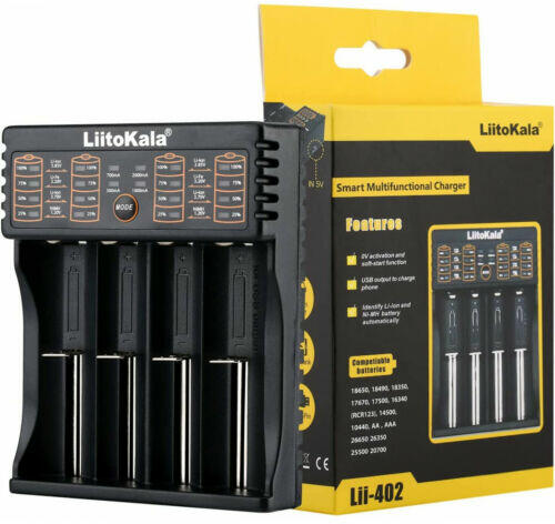 Négycsatornás USB Li-Ion akkumulátor töltő. Tulajdonságok: 3.6-3.7 V Li-ion: 10440 / 14500 / 14650 / 16340 / 17500 / 17670 / 18350 / 18490 / 18500 / 18650 / 18700 / 20700 / 21700 / 22650 / 25500 / 26650 Ni-MH, Ni-CD: AAAA / AAA / AA / A / SC / C / D Egyszerre lehet vele tölteni Li-ion, Ni-Mh és NiCd cellákat és elemeket, a töltő felismeri a behelyezett telepeket Négy független tölt