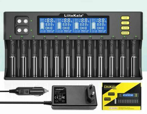 LiitoKala Lii-S12 tizenkét töltőcsatornás 18650 LCD Lithium-Ion Li-Ion akkumulátor/cella töltő Tulajdonságok: 12 darab független töltőcsatorna, széles akkufészkek, akár 12db 21700-as méretű cella is tölthető vele egyszerre 2x 9V akkumulátor töltési lehetőség Töltőáram Li-Ion akkuk esetén: 6x 1A (slot 1/3/5/7/9/11) vagy 12x 0.5A Töltőáram Ni-Mh / Ni-Cd akkuk esetén: 1