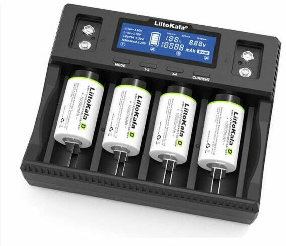 LiitoKala Lii-D4XL extra széles négycsatornás 18650 21700 26650 32700 LCD Lithium-Ion Li-Ion és 9V akkumulátor töltő Tulajdonságok: Extra széles töltőcsatornák, így akár négy darab 21700 / 26650 / 32700-as cella egyidejű töltésére is alkalmas. Fizikai gombok: MODE, 1-2 illetve 3-4 csatornaválasztó gombok, CURRENT MODE gombbal válaszható Li-Ion töltési szabványok: 3.7V / 3