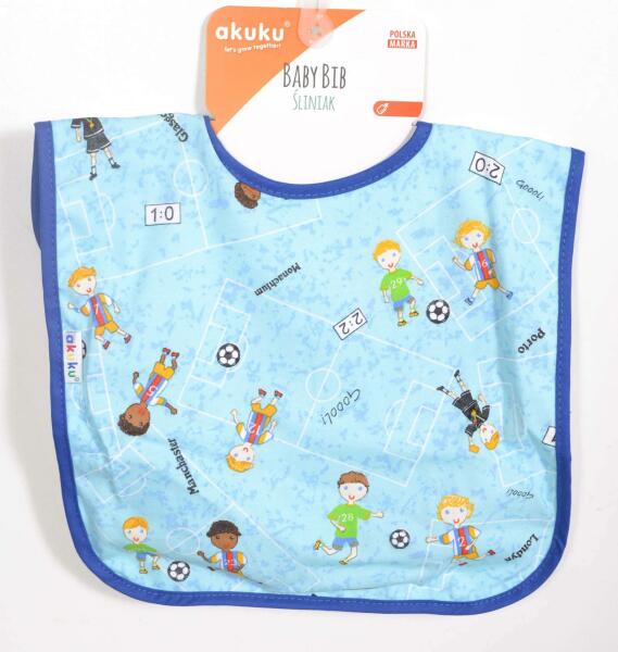 Színes gyerek előke Akuku vidám képekkel. Két rétegből áll. Anyaga: első oldala 100% pamut, belső lágyítot PVC. Mérete: kb 27x27 cm.