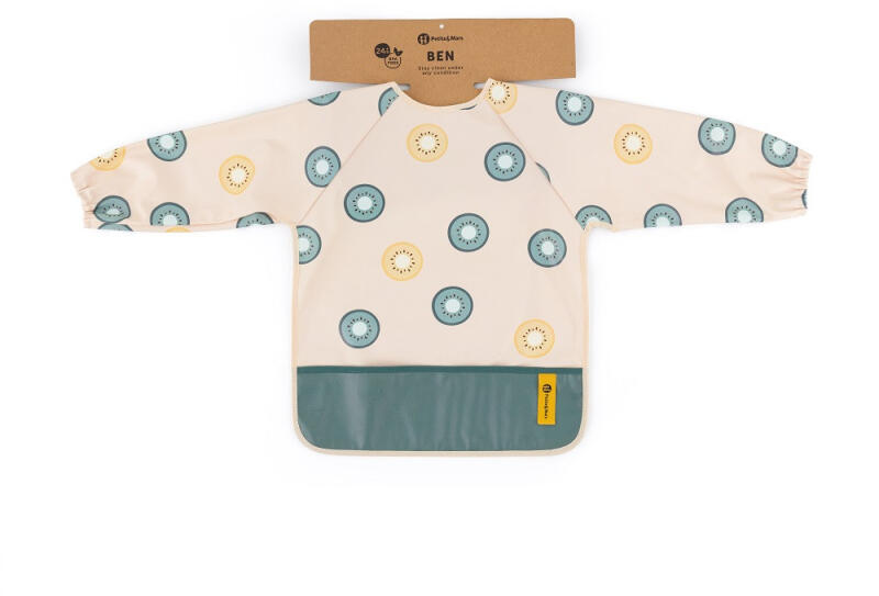 A PETITE&MARS Előke hosszú ujjal Ben Green Kiwi színben a kisgyermekek étkezéseinek és kreatív tevékenységeinek tökéletes kiegészítője. Ez a praktikus, vízálló előke poliuretánnal (PU) bevont poliészter anyagból készült, amely gyorsan szárad és teljesen PVC- és ftalátmentes. A hosszú ujjú kialakítás és a morzsazseb biztosítja a ruhák védelmét, így a gyermek