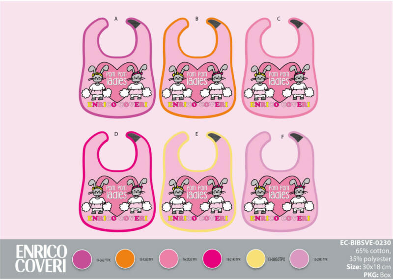 Enrico Coveri 6 darabos baba pamut előke szett tépőzáras nyakpánttal, különböző színekben. Anyag: 65% pamut, 35% poliészter