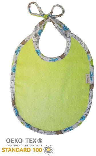 Vaganza kerekített nyálkendő, vízhatlan Patenttal záródik, állítási lehetőséggel. Az egyik oldala vízhatlan, a másik pamut. Anyagában mintás.