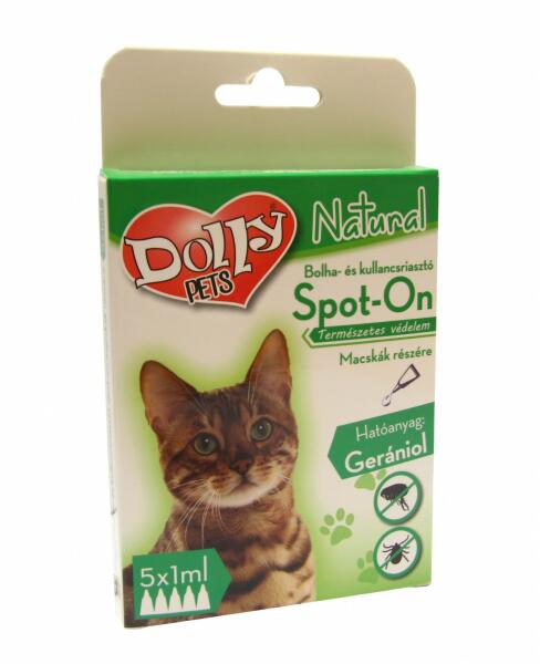 Dolly Natural bolha- és kullancsriasztó spot on macskák részére Biocid terméktípus, termékforma: 19. terméktípus, riasztószer, spot on oldat Hatóanyag: Gerániol 0,3 g/100 g (CAS szám: 106-24-1), Felhasználási terület: Bolha- és kullancsriasztó hatás kifejtése macska testfelületén. Felhasználási kör: Lakossági felhasználásra Célálla t: macska Célszerve zetek: bolha,