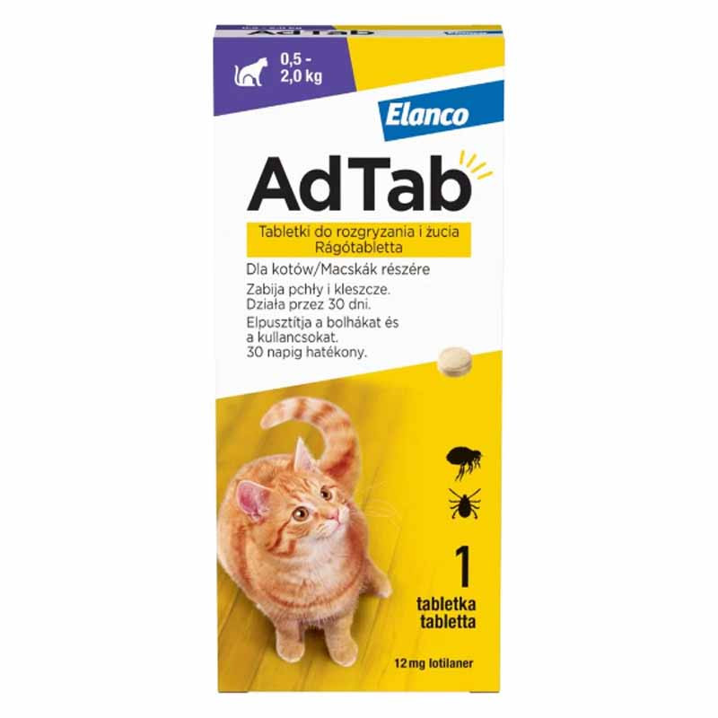 Adtab rágótabletta macskáknak, bolha- és kullancsfertőzöttségének kezelésére Az állatgyógyászati készítmény azonnali és tartós ölő hatással bír 1 hónapon keresztül bolhák (Ctenocephalides felis és C. canis) és kullancsok (Rhipicephalus sanguineus, Ixodes ricinus, I. hexagonus és Dermacentor reticulatus) esetében. Nézd meg az ADTAB többi termékét Adtab rágótablett