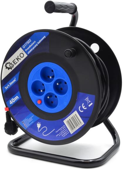 Hosszabbító kábel dobra feltekerve 40m GEKO 3x1,0mm2-es keresztmetszettelHosszabbító kábel 40 m-es hosszal belső térben való használatra. A hosszabbító dob 4 db csatlakozóval és hőbiztosítékkal van ellátva túlterheltség ellen. A fedés szintje IP20 - 12 mm-nél nagyobb részecskék elleni védelem, víz elleni védelem nélkül. Technikai paraméterek:Hossz: 40 mFeszültség: 2