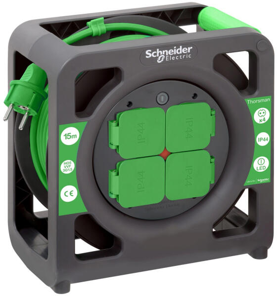 2 pólusú műa. kábeldob műa. tartóval IP44 15fm MT 3x1,5mm2 4x2P+F IMT33136 Thorsman Schneider Ezt az IMT33136 kábeltekercset olyan magán- és barkácsfelhasználók számára tervezték, akik szívesen foglalkoznak kisebb elektromos projektekkel. 4 schuko aljzatot kínál 15 m hosszú kábellel (HO5 VVF 3G1.5 / zöld) IP44 védelem a por és a nedvesség ellen Ez az orsó ergonomikus teker