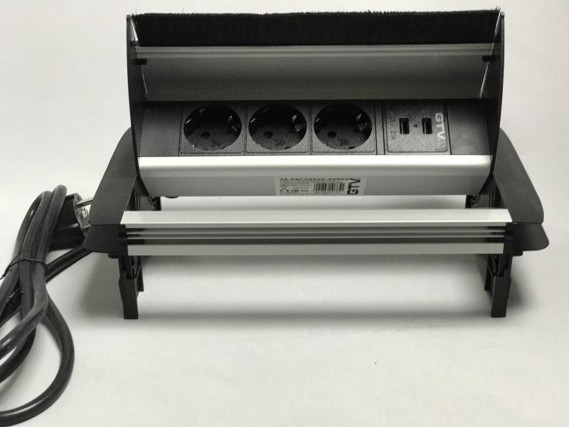 Süllyeszthető elosztó kábelkivezetővel: bútorba, irodai asztalba, konyhapultba beépíthető elosztósor 3 darab dugaljjal és 2 darab USB csatlakozással. Fekete alumínium házban, kizárólag beltéri használatra. Praktikus, kis helyet foglal és elegáns, köszönhető rejtett kialakítás ának. Használaton kívül a fedél az asztal síkjába van hajtva, szükség esetén pedig könn