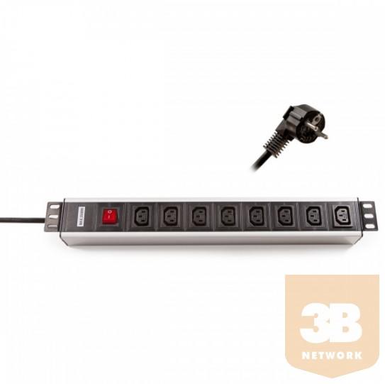 Triton 620I08 19-os elosztópanel, 8 x IEC320 C13 világító kapcsolóval, amely védve van a véletlen lekapcsolás ellen M6-os kosáranya készlet (4db) Műszaki leírás Névleges feszültség 250V Névleges terhelési áramerősség Σ IN 16A Méretek 45 (1U) x 485 (19) x 45 mm Tápkábel hossza 2,5 m