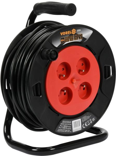 A kábel vastag gumiszigeteléssel rendelkezik. A könnyű szállítás érdekében a keretre egy gumiheveder van szerelve. 4 csatlakozóhelyes, földelt hosszabbító kábel, amely több készülék egyidejű csatlakoztatására ad lehetőséget; hőbiztosítékkal is rendelkezik. Hosszabbító kábel típus: Dob Max. áram: 16 A Feszültség: 230 V váltakozó áram Frekvencia: 50 Hz Aljzat típ