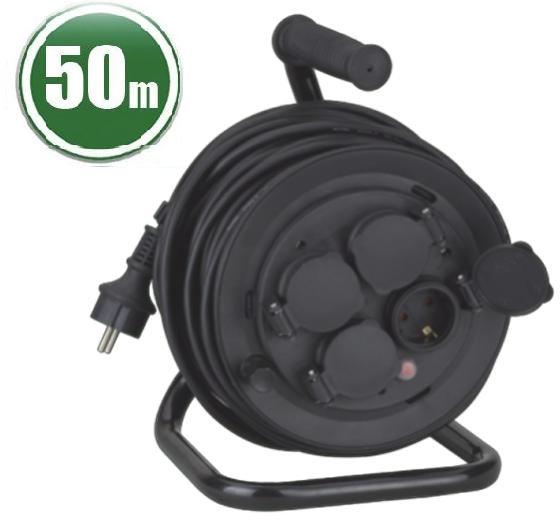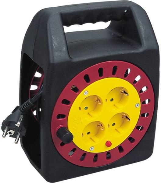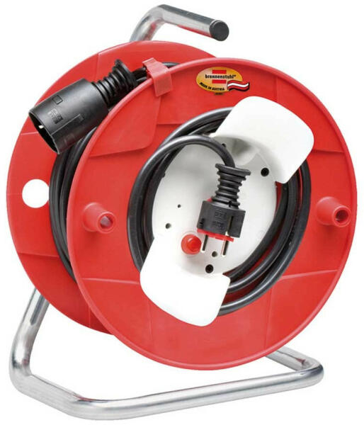 Hosszabbító kábeldob dugasszal és csatlakozó aljzattalA dobtest különleges gumiból készül, és horganyzott állványra van rögzítveErgonómiai szempontok szerint tervezett tengelyes fogantyú a tökéletes kábelmegvezetéshez a le- és a feltekercselés soránTúlhevülés elleni védelem, ellenőrző lámpa túlhevülés vagy túlterhelés esetén