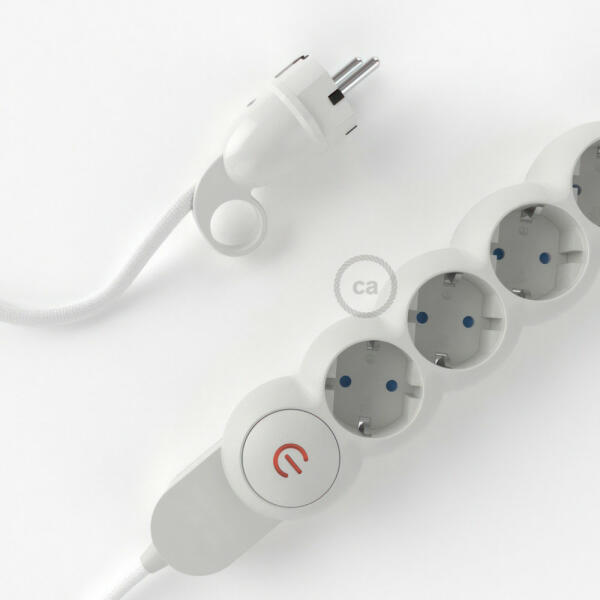 A fehér szövet RM01 Creative-Cables műselyemborítású elektromos kábellel ellátott elosztó nem a szokásos többszörös aljzat! A 4 Schuko/10A aljzat átlósan van elhelyezve a transzformátorok által elfoglalt hely optimalizálása érdekében. A nagy keresztmetszetű kábel (1,5 mm2) 100%-ban Olaszországban készült. A schuko dugó kényelmes gyűrűvel van ellátva, amely nagyon meg