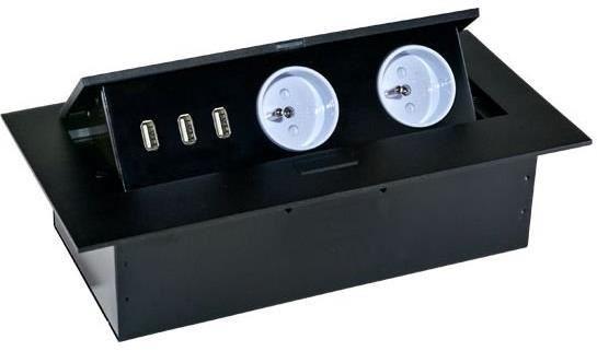 Két darab 2P+Z aljzatból álló készlet három USB-porttal (tápegység nélkül), visszahúzható felső fedélben. Íróasztalokba, asztallapokba és asztalokba történő beltéri telepítésre tervezték függőleges és vízszintes helyzetben egyaránt, miközben hozzáférést biztosít a konnektorokhoz. Műszaki leírás Általános információk: Modell magasság: 67 mm Összecsukható: