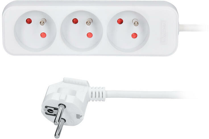 Hosszabbító 3 dugaszolóaljzat gyermekvédelemmel, megvilágított bipoláris billenőkapcsolóval, 3 m-es tápkábellel. Előnyök: - nikkelezett oldalvédő érintkezők - a ház mechanikai ütéseknek ellenálló műanyagból készült - speciális kialakítású ház a tápkábel vezetéséhez - kivehető ház a tápkábel cseréjének lehetőségével - karimák fali/bútorrögzítéshez