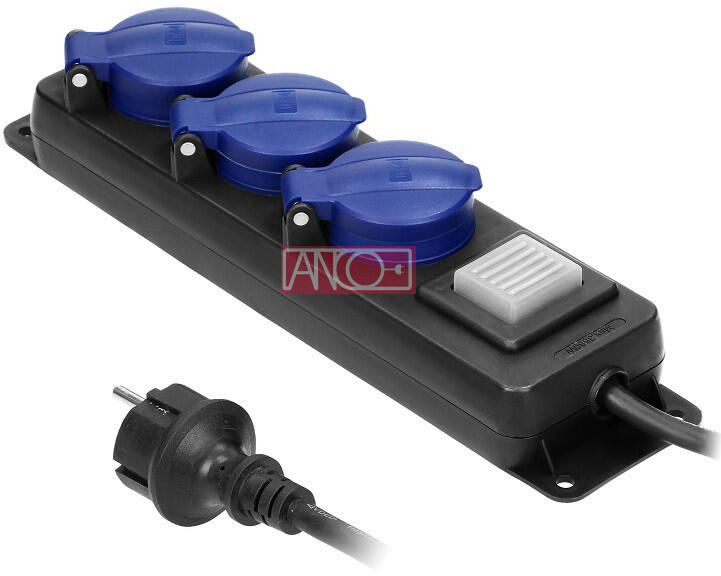 321777 - 3db vízmentes földelt csapfedeles elosztó - 3m H05RR-F 3x1.5 mm2 gumi kábellel - IP44: kültéri használatra; apró méretű szilárd tárgyak ellen védett (>1 mm) - földelt, csapfedeles - 16 A; 250 V; maximális terhelés: 3680 W - fekete
