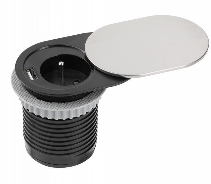 Asztalba süllyeszthető elosztó, 1 dugalj, 1 USB. USB(5V, 2,4A) Szín: Ezüst Védettség:IP20Átmérő: 60mm
