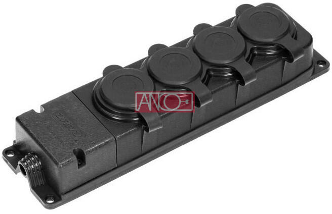 321793 - 4 -es földelt dugalj, 16A - gumi védőgyűrűvel és védősapkával - IP44: kültéri; apró méretű szilárd tárgyak ellen védett (>1 mm); fröccsenő víz ellen védett minden irányból - egyenes, masszív kivitel - tűzálló - sorkapcsos bekötés - falra szerelhető - kampóra akasztható - fekete