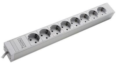 Hálózati elosztó kapcsolóval, 7 részes, 19", Digitus 8 dugalj, 230V / 16A / 3600W · PVC fix test csatlakozó · A kimenetek 35°-ban elforgatva · 2 fém tartóval · 2 m kábel, H05VV-F 3G1,5mm2 · Jobbra hajlított védőérintkezős dugó dupla földeléssel. Műszaki adatok: Csatlakozóalj típus: Védőérintkezős dugalj · Dugaljak száma: 8 · Feszültség (max. ): 230 V/AC · Háló