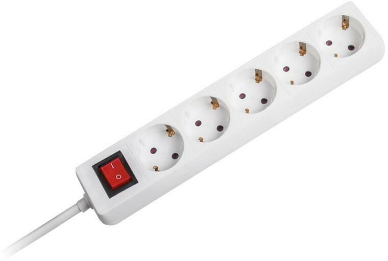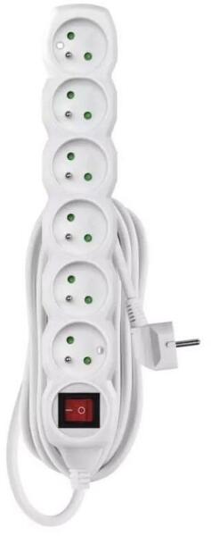 Hosszabbító kábel aljzatokkal és kapcsolóval. A vezeték keresztmetszete: 1,5 mm2. Vezető: H05VV-F3G. Áram: 16 A max. Max. terhelés: 3680 W. Aljzatok száma: 6. Hossz: 5 m.